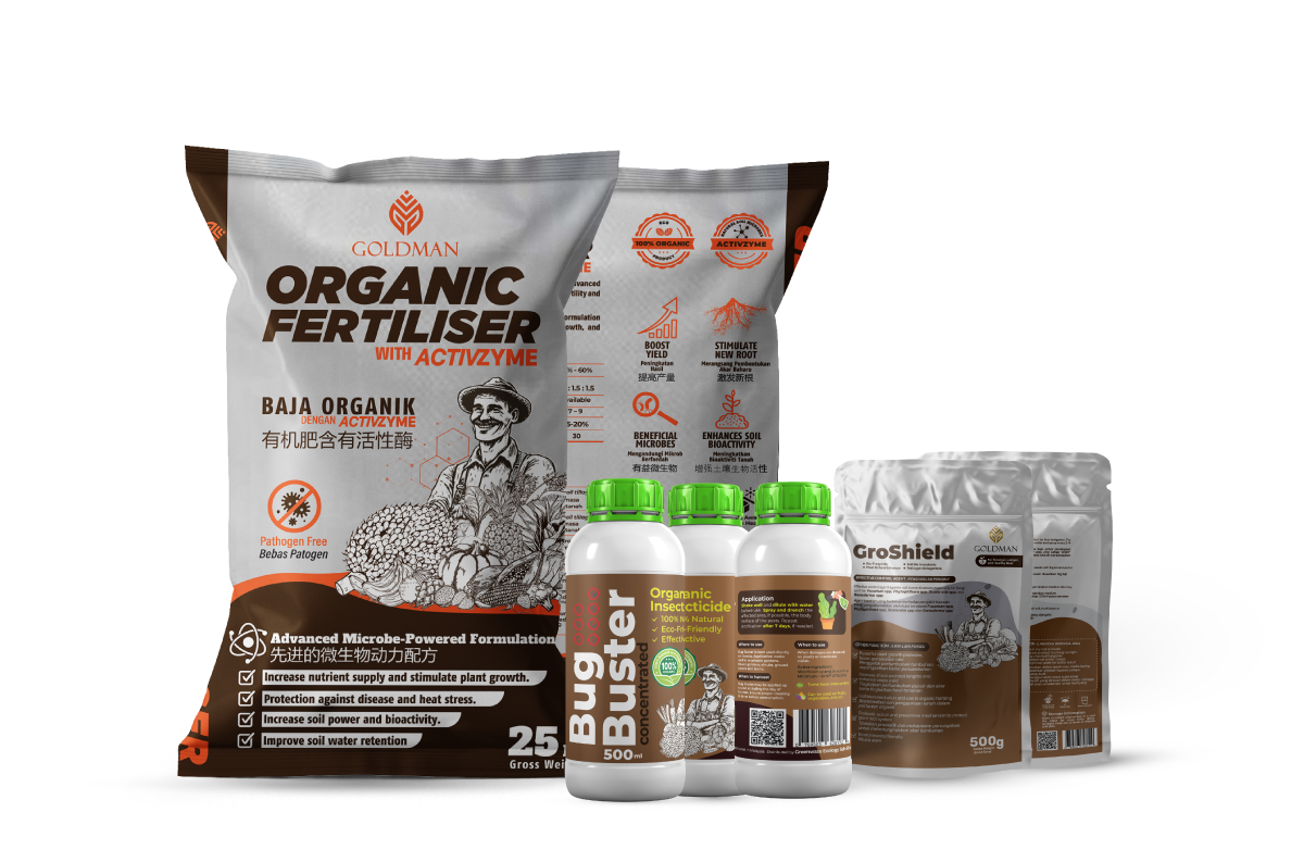 Goldman is a locally trusted brand offering a diverse array of agricultural solutions including organic fertilizers, potting soils, bio-fungicides , and bio-pesticides With a decade-long commitment to research and development across Singapore and Malaysia, our products are meticulously crafted to address the evolving needs of farmers.